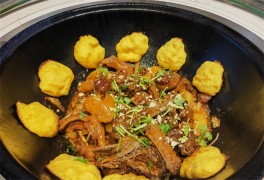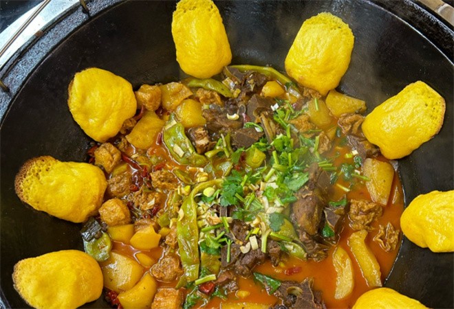 東北鐵鍋燉大鵝,現(xiàn)燉的鵝肉,香味撲鼻。終于等到吃上的時(shí)候,真的是美味極了!鵝肉鮮嫩多汁,裹滿了濃郁的湯汁,簡直讓人欲罷不能。而且配菜也很豐富,一次吃到爽!鵝肉表皮緊致,內(nèi)里香嫩,就著湯汁嗦嚼真是香到不行。玉米貼餅,鐵鍋燉的標(biāo)配——玉米貼餅也是一大亮點(diǎn)。餅子是粗糧,外脆里嫩,口感非常棒,健康又美味。鱘鰉魚鍋也是必點(diǎn)菜品之一。魚肉鮮嫩多汁,吃起來特別過癮。茄子很嫩,粉條有勁道入味兒,最好吃的是豆腐,魚味兒滋潤到豆腐內(nèi),香到不行!甜品藍(lán)莓山藥也很棒,脆脆的,淋上藍(lán)莓醬,酸甜可口,是一道非常棒的甜品和涼菜。