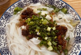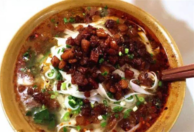 那米粉、原湯、佐料都是當地的原汁原味。米粉的米,多來自海拔四百到六百米高度種的水稻,稻谷顆粒飽滿。浸泡后的米脹得更加飽滿。這樣的米磨出來的漿稠糊有度。米漿在蒸盤里攤平,蒸一小會兒,凝結成一張厚薄適宜的米皮。把米皮揭起來晾著,待熱氣逐漸退散,米皮會變得輕薄透亮。再隔上一陣子,米皮上的水分就慢慢蒸發干。至于把米皮切寬切窄隨意。底湯、臊子及蔬菜也有講究。底湯的原料搭配是私家秘笈,蔬菜的配置倒簡單,以空心菜和萵筍為主,臊子的肉不能太肥也不能太瘦,要腿子肉、夾子肉才好。