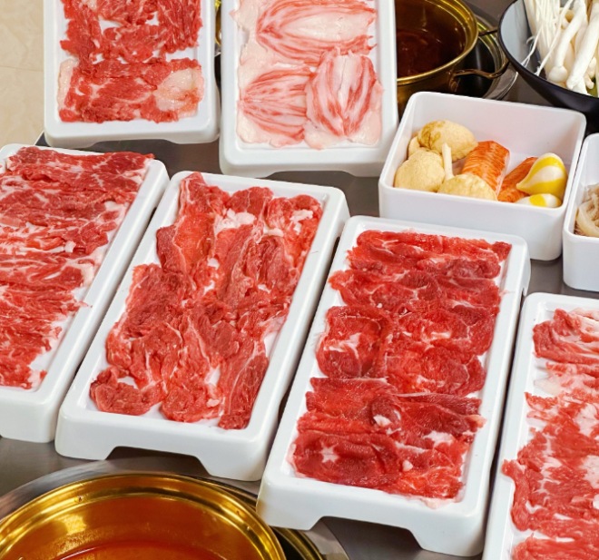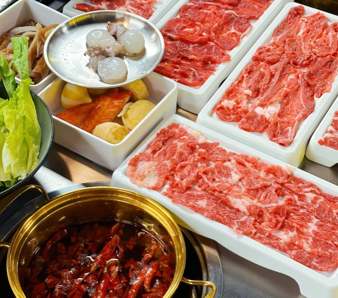 關小滿自助烤肉鮮切牛肉火鍋菜品主打就是現切牛肉,安格斯牛上腦,現切吊龍,原切板腱,高鈣羊羔肉等等,現切廚房就在肉盤旁邊,新鮮看得見!