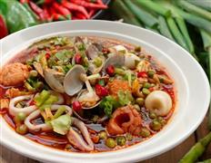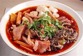 冒菜就是將新鮮的生葷、時蔬菜品集于一簍,置入沸騰的湯汁中燙熟后,裝進配有調料和高湯的碗里即上桌食用的菜肴。冒菜按所配調料的不同,可分為麻辣、香辣、酸辣、泡椒、清香、菌香、三鮮等多種味型。冒菜因其就餐形式簡單,制作過程快捷,菜品上餐迅速,而劃歸為“快餐”之列,又因“即燙即食”之法與火鍋相似,故有“冒菜是一個人的火鍋,火鍋是一群人的冒菜”之說,走南闖北只為一份美味--合香冒菜。