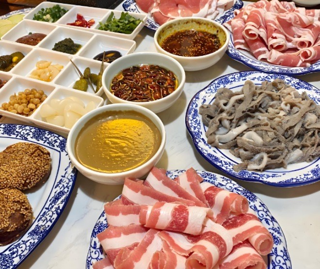 龍園涮肉銅鍋涮肉搭配濃郁的麻醬,簡直是絕配!麻醬的濃稠感讓人感受到原料的高品質(zhì),每一口都是對味蕾的極致享受。還有「麻醬燒餅」,外表酥脆,濃濃的芝麻香味,一口咬下去真的太滿足了?!葛B(yǎng)生烏雞卷」也是必點的,肉質(zhì)鮮嫩的烏雞卷在菌湯鍋里涮一涮,蘸著秘制辣椒油,香而不辣,別有一番風味。還有超多菜品,手切牛羊肉、菌類拼盤、蟹柳、牛肉丸等等等等,每一個搭配秘制芝麻醬都是一絕。