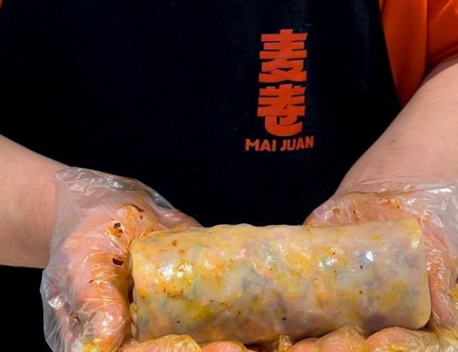 麥卷涼皮造物局2023年成立,品牌堅守祖傳制作工藝,從面團清洗、沉淀過濾到調漿蒸制,每一道工序都精益求精,最終成就薄如蟬翼、透光亮澤且韌性十足的地道面皮。在此基礎上,品牌創新推出十余種爆款產品:雞腿卷涼皮的鮮嫩多汁、藤椒雞排卷涼皮的麻辣鮮香、蝦滑卷涼皮的Q彈爽口,搭配爆酸山楂豆腐花、發光葡萄汁等特色輔品,形成豐富產品線,滿足不同年齡段消費者的口味需求。
