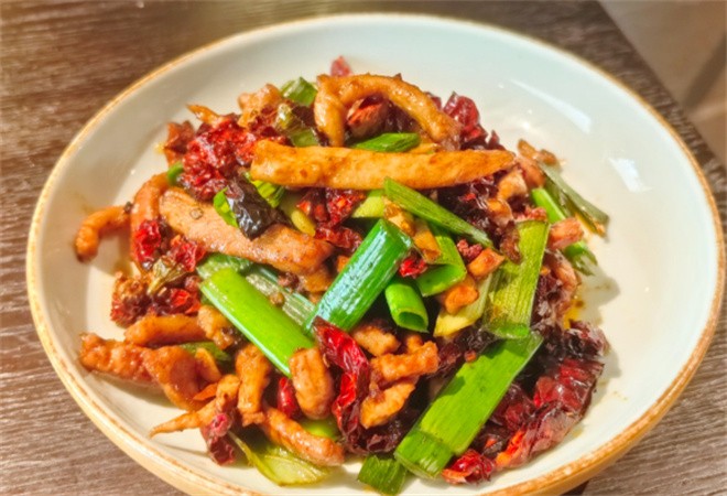 上山下山貴州菜鍋底用發(fā)酵酸湯+新鮮番茄熬制,配豬肉末和脆哨,酸辣層次豐富。用竹叉“奪”起粉塊和配菜,儀式感滿分。推薦加脆皮五花肉(28元),油脂香與酸湯碰撞絕妙。黔味辣子雞與川式辣子雞不同,貴州版更重“糍粑辣椒”的香醇!雞肉軟嫩入味,辣度溫和帶微甜,連花生米都裹滿醬汁,下飯神器。