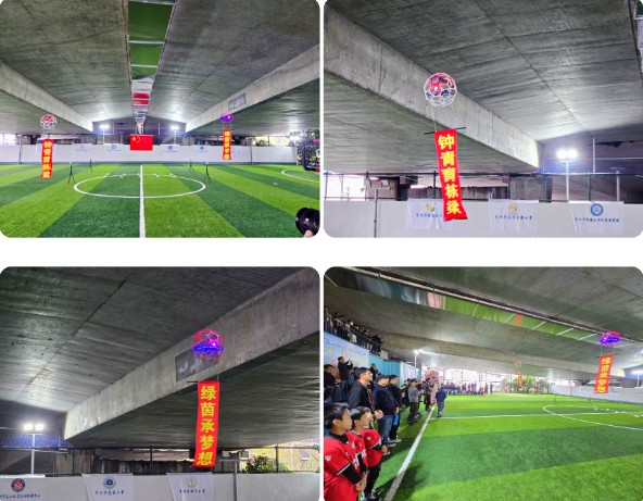 接著,拓普思編程無人機表演正式開場。數十架無人機在預設程序的操控下,在空中整齊列隊,它們化作一道道靈動的光影,隨著音樂的節奏,無人機的燈光不斷閃爍、變換,與音樂完美融合,形成了一場美輪美奐的視聽盛宴。這場表演不僅為比賽增添了濃厚的科技氛圍,也讓孩子們感受到了編程的魅力和創造力,激發了他們對科技的熱愛和探索欲望。而拓普思飛盾400足球無人機的登場,再次讓現場沸騰。只見兩架體型稍大的飛盾400無人機,穩穩地拖著分別寫有“綠茵承夢想”、“鐘青育棟梁”的橫幅,從綠茵場上空緩緩飛過。