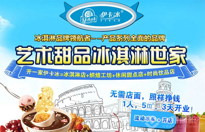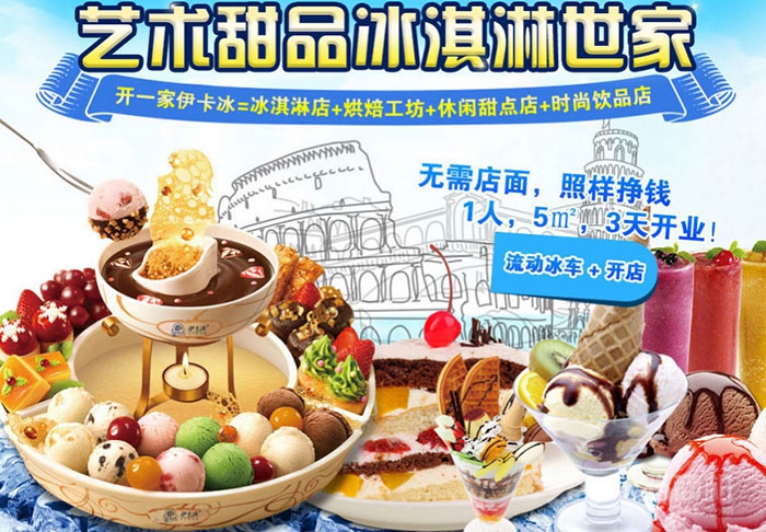 伊卡冰冰淇淋是一家歐式連鎖合作品牌,藝術甜品冰淇淋世家,經營“自然、健康、養生百變花式冰淇淋,全天然進口原料,濃情愛意伊卡冰百年家族工藝。冰爽自然,珍饈美味,口感細膩軟滑,讓您擁有濃稠纏繞戀上戀的親切體驗,唯有極尊貴的成分,才能凝住青春!美味、時尚、健康的伊卡冰冰淇淋為您營造“冰凍與熱烈”的機制口感。