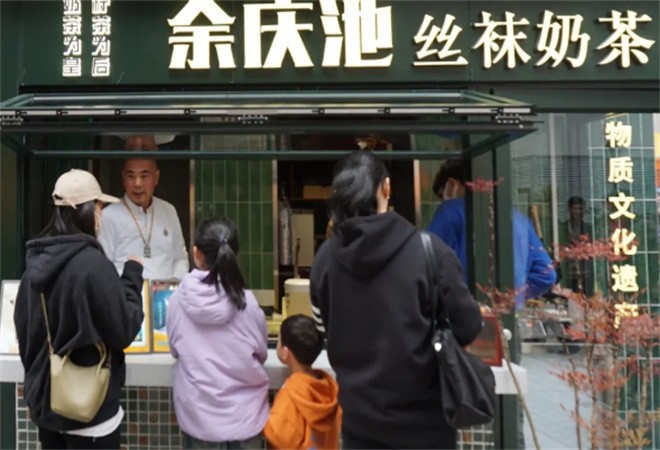 傳統(tǒng)絲襪奶茶是深圳市非物質(zhì)文化遺產(chǎn),余慶池奶茶則是絲襪奶茶制作技藝的第四代傳承人。余慶池與絲襪奶茶的相遇,源于茶餐廳的一頓飯。當(dāng)時師傅做的絲襪奶茶為其帶來了驚艷的口感,沒有傳統(tǒng)港式奶茶的苦澀,反而是甜而不膩,這也讓余慶池奶茶投入了對絲襪奶茶完美配方的研究。絲襪奶茶的制作有著多種變數(shù),保留茶香和融合撞奶的把控需要一定的技藝。在醒茶、煲茶、撞茶、加奶、攪拌、裝杯六道工序下,將八種優(yōu)質(zhì)紅茶與純牛奶融合碰撞,才能達(dá)到一定綿柔絲滑的口感。